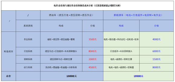 从上图可得知在批量制造的情况下,纯电底盘+电作业系统的制造成本比油底盘+油作业的制造成本基本持平。